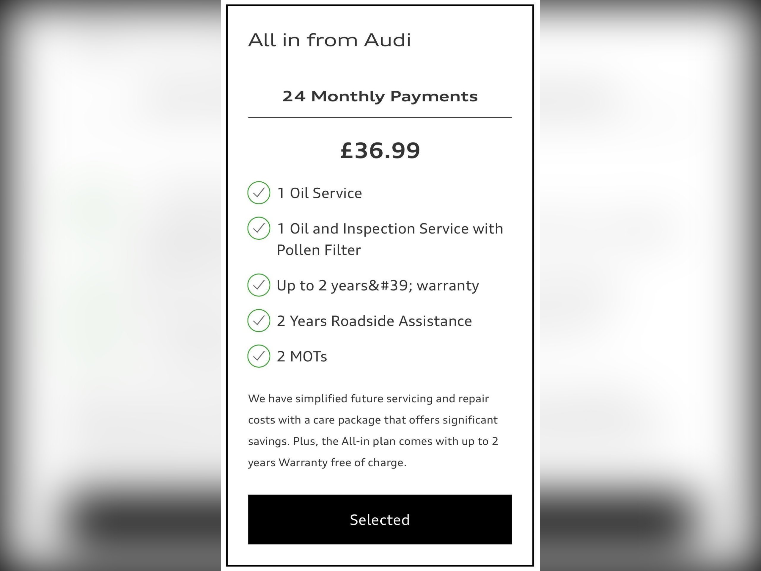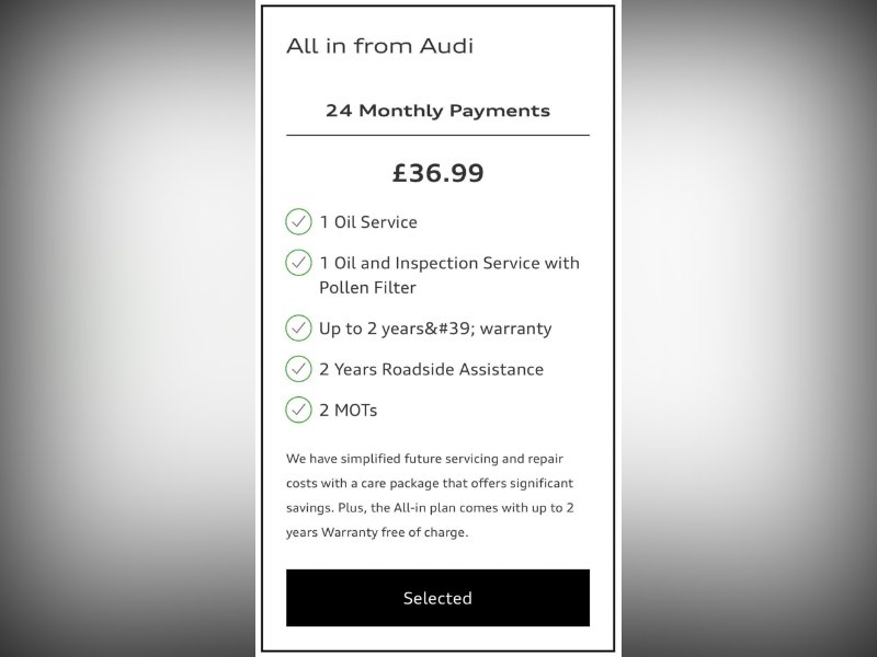 This car also qualifies for the  Audi UK 'All In Service Plan' offer, this includes 2x services by AUDI Main Dealer, 2x MOT's, 2 years road side assistance and up to 2 years warranty for only £36.99 a month for 2 years! Search Audi service plans online for more information.